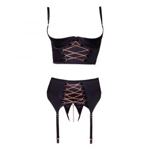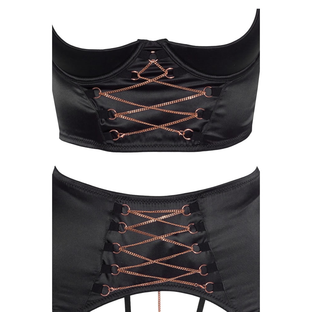 Čudovit set perila z razporki, sestavljen iz topa, pasu za nogavice in hlačk. Top ima oblikovano košarico z oporo za prsi. Zapenja se s kaveljčki na hrbtni strani. Naramnici sta elastični, s prilagodljivo dolžino. Sprednji del topa je dekoriran s kovinsko verižico v rose gold barvi. Pas za pripenjanje nogavic je v enakem slogu, s kovinskimi zaponkami za pripenjanje nogavic in prilagodljivo dolžino paščkov. Hlačke so z razporkom v razkoraku, v razporku imajo kovinsko verižico, ki se jo lahko odstrani. Cel komplet je iz gladkega elastičnega satena.