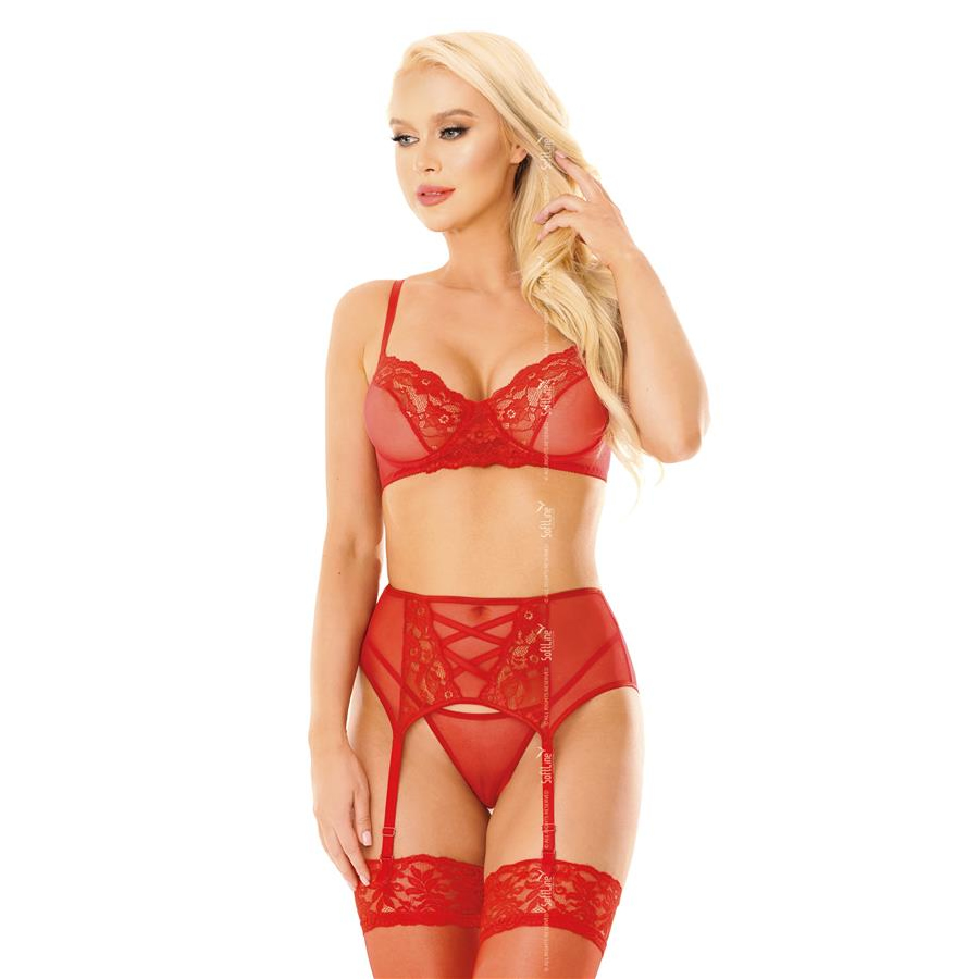 Ženski komplet sestavlja modrček, pas za nogavice in hlačke. Modrček ima mehki košarici z všito oporo za prsi, zapenja se na hrbtni strani s kaveljčki. Košarici modrčka krasi čipka. Naramnici sta ozki, nastavljivi po dolžini. Pas za pripenjanje nogavic na sprednji strani krasi čipka in pekrižani dekorativni trakovi. Zapenja se ga na hrbtni strani s kaveljčki. Dolžina paščkov za pripenjanje nogavic je prilagodljiva. Ujemajoče tanga hlačke so enostavne, prosojne, elastične, da se povsem prilegajo.