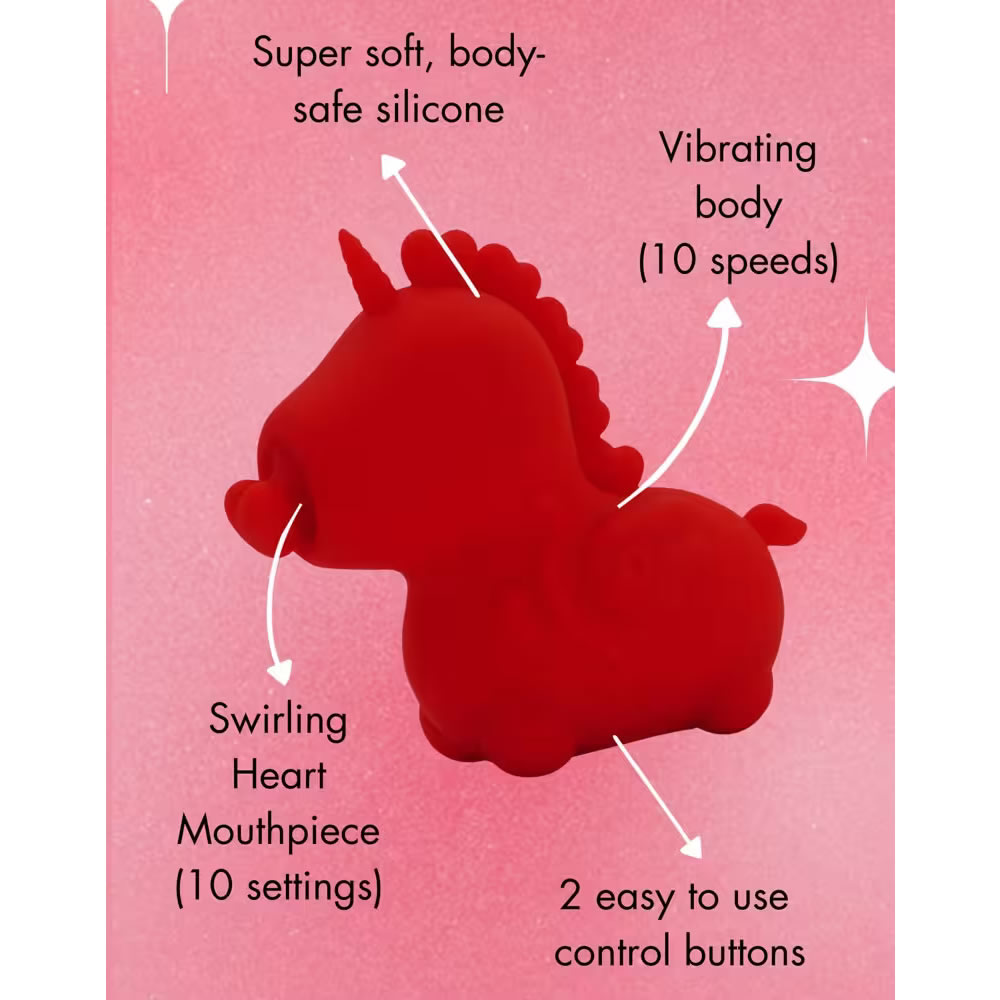 Simpatičen vibrator Cupids Beau (vibrator z jezikom v obliki srca) znamke Unihorn je v obliki majhnega samoroga. Mehka, enostavna za oprijem, silikonska igračka zagotavlja vrtinčasto magijo med stegni. Njen mehak, majhen jezik v obliki srca se vrti in utripa, da zadovolji klitoris. Poleg tega intenzivne vibracije podpirajo to edinstveno stimulacijo.