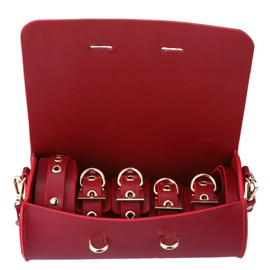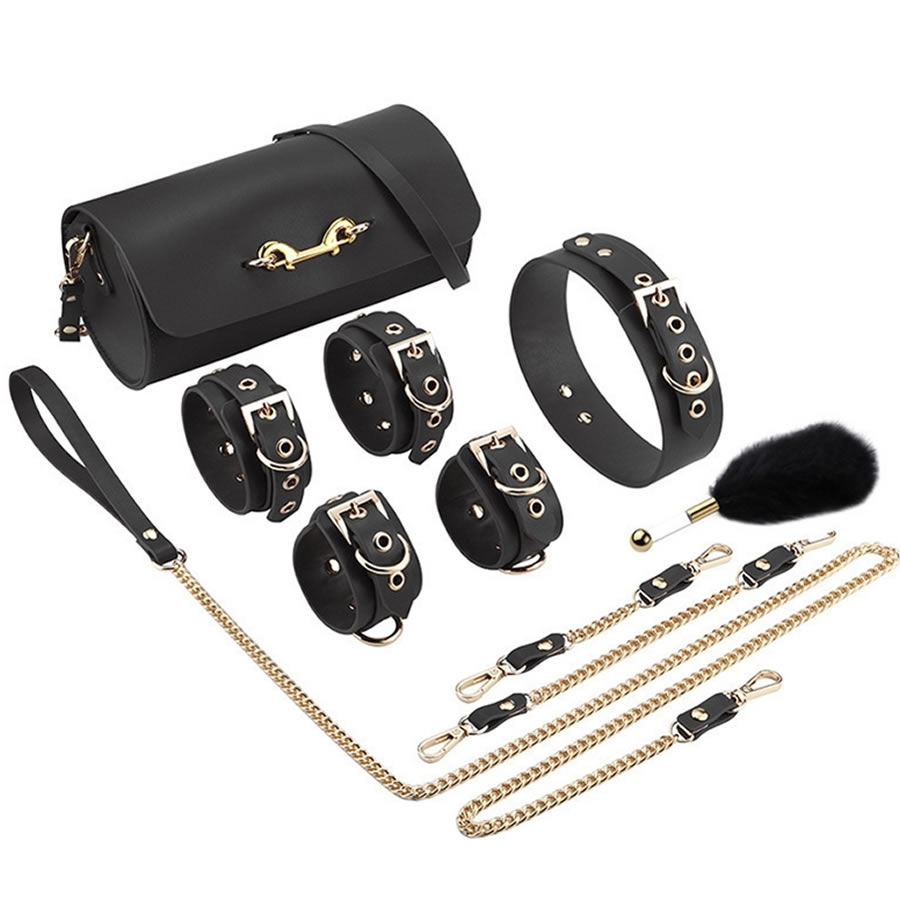 Ta kvaliteten set bdsm erotičnih igračk luksuznega izgleda je izdelan iz pravega usnja. Set sestavlja torbica za shranjevanje in naslednje bdsm igračke: