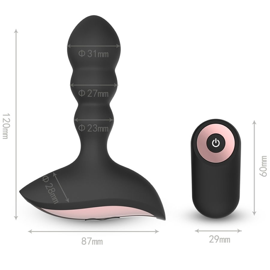 Vibracijski analni čep oz. kroglice so izdelane iz silikona. Upravljajo se preko gumba na izdelku in brezžično – preko daljinca. Čep ima razširjeno bazo za varno uporabo, hkrati pa ti razširjena baza omogoča bolj čvrst oprijem v roki. Baza čepa in daljinec sta okrašena s sijočim detajlom v modni “rose gold” barvi. Vibrator vibrira in pulsira v 10 vibracijskih ritmih.
