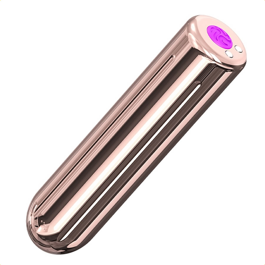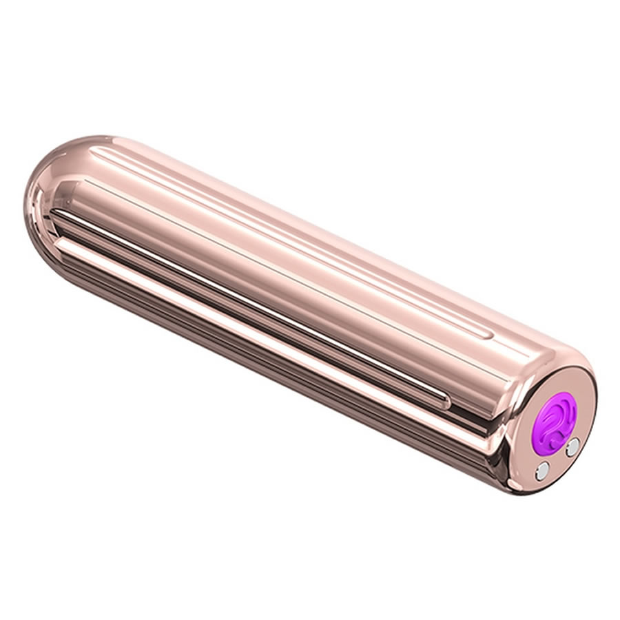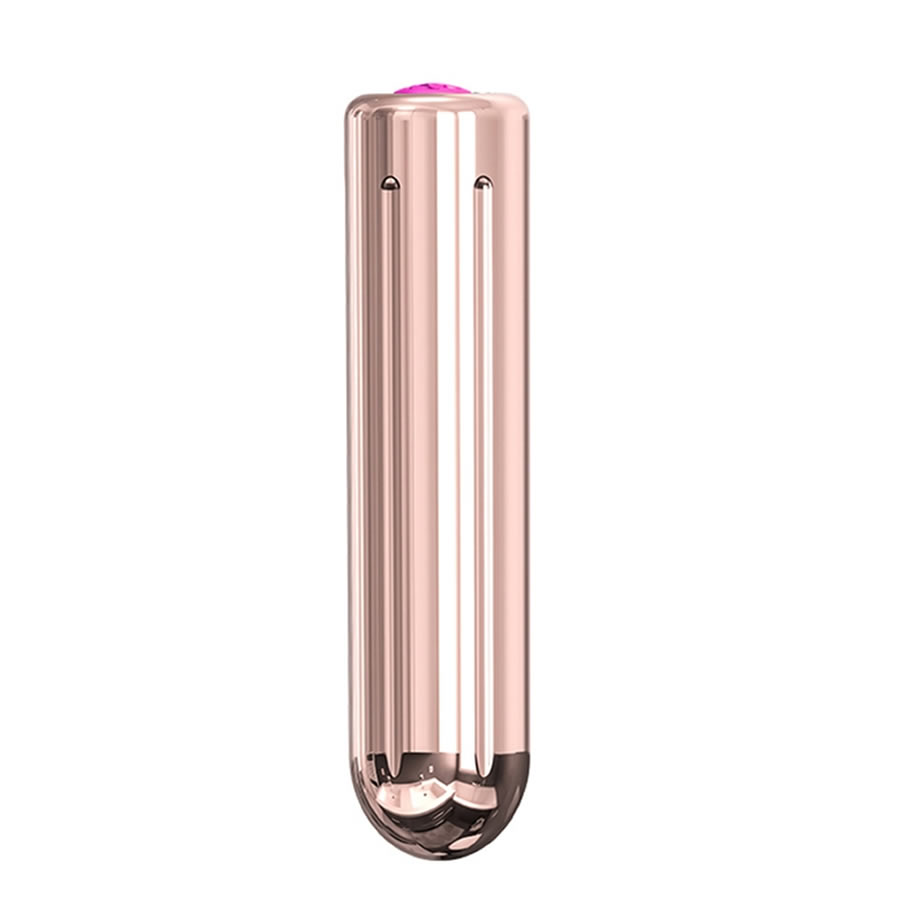 Izjemno eleganten mini vibrator v rose gold barvi. Njegova površina je povsem gladka in sijoča. Vibrator ima močan vibracijski motorček, ki vibrira in pulsira v 9 vibracijskih intenzitetah in vzorcih. Napajanje tega vibratorja je preko vgrajene akumulatorske baterije.