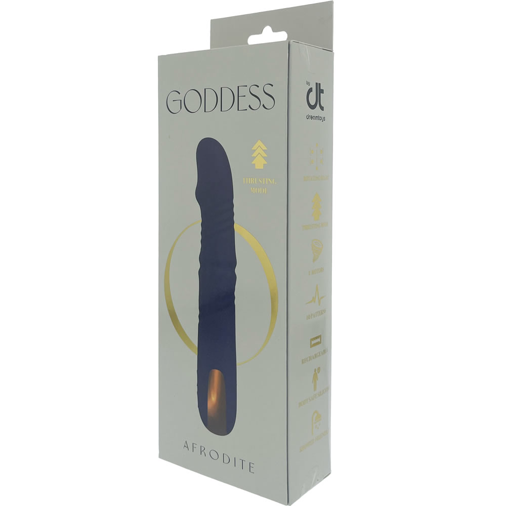Vibrator Afrodite iz kolekcije Goddess Collection ima 10 možnosti vibriranja in 7 gibanj gor in dol v 3 hitrostih. Za lažjo uporabo so gumbi za upravljanje funkcij gor in dol ter vrtečih se kroglic ločeni. Vibrator vodotesen in tako primeren za prhanje. Izdelan je iz materialov varnih za telo, polni se s priloženim magnetnim kablom USB.