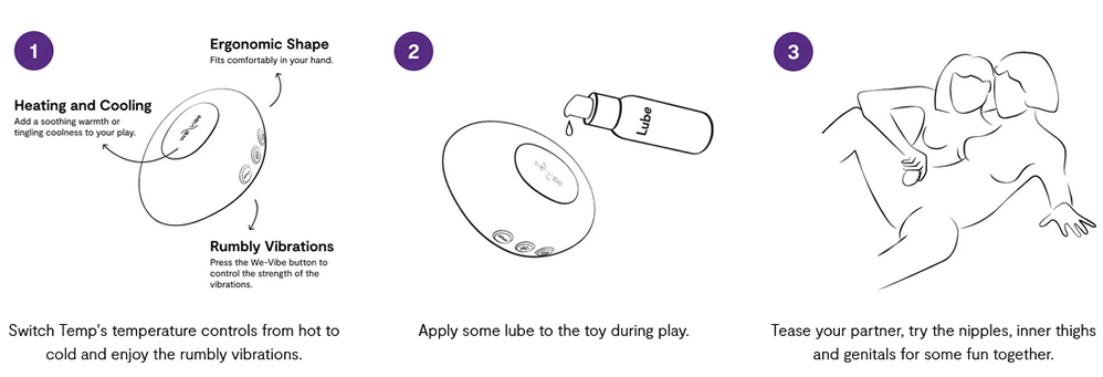 Tih, kompakten vibrator Temp znamke We-Vibe med intimno igro vzbudi vse čute zaradi funkcij ogrevanja in hlajenja. Intenzivne vibracije zagotavljajo dodaten užitek za klitoris in vse druge zunanje vroče točke.