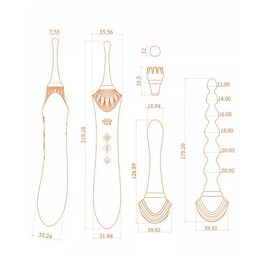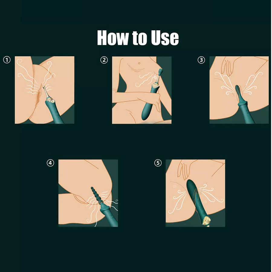 - Štirje rokavčki – vitek rokavček za stimulacijo točke G, rokavček v obliki cveta ustvari žgečkljivo stimulacijo za klitoris ali bradavičke, okrogel rokavček za direktno točkovno stimulacijo klitorisa in rokavček za analno stimulacijo v obliki analnih kroglic