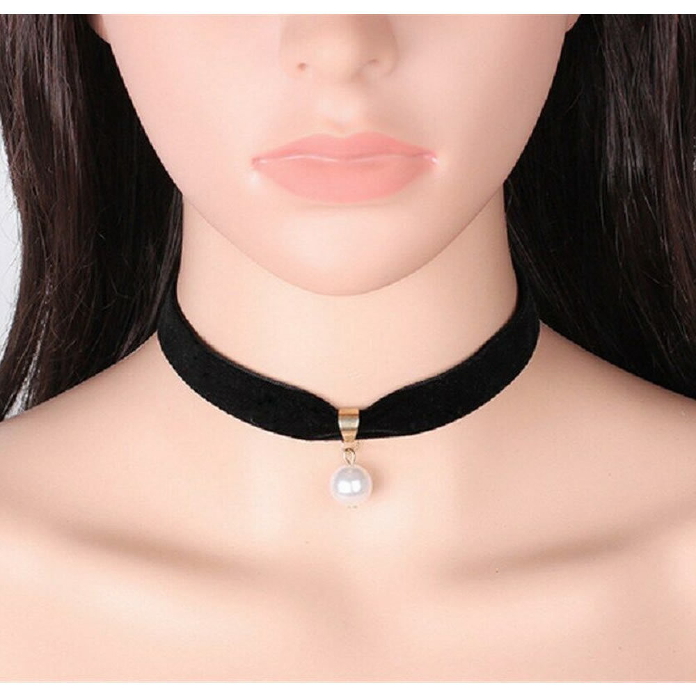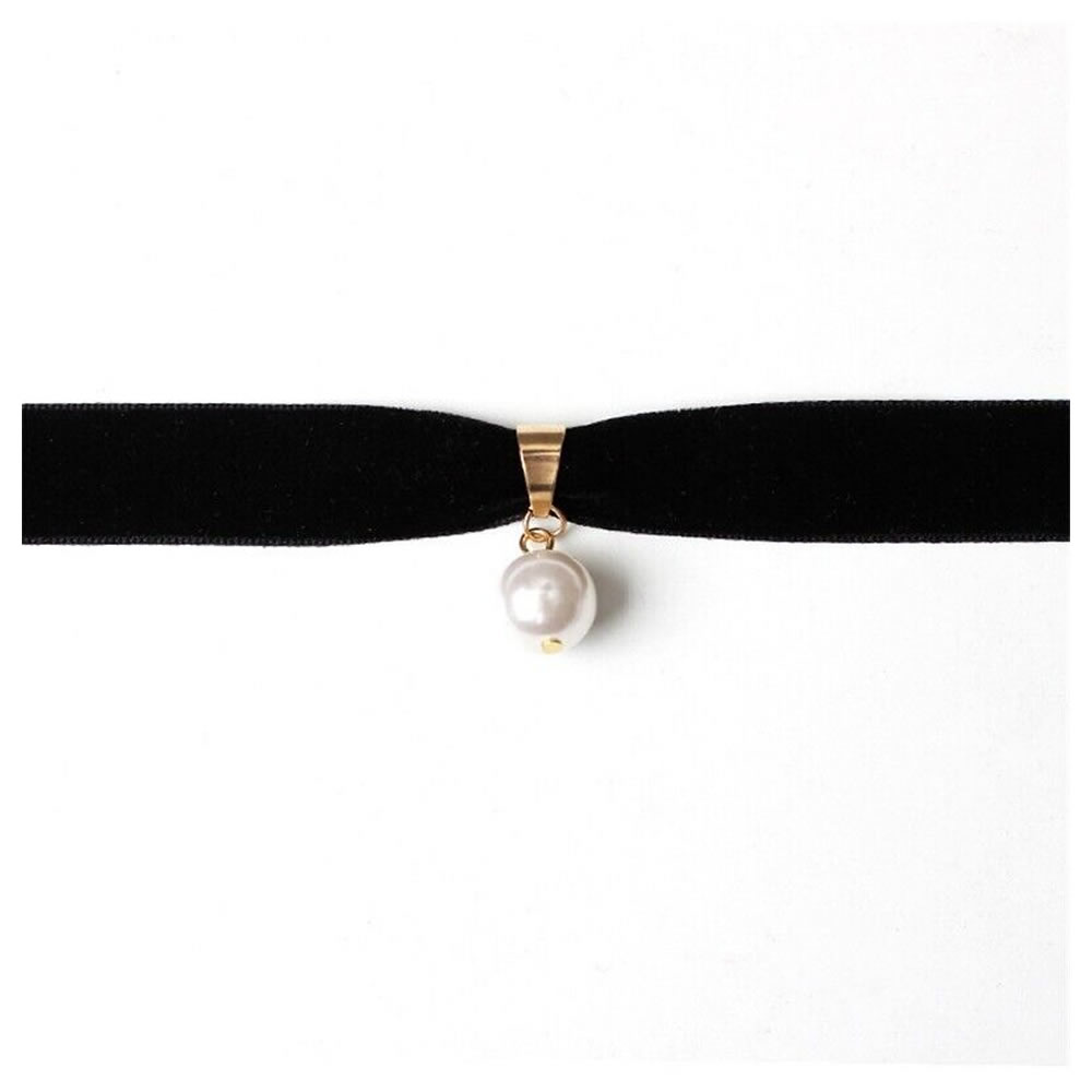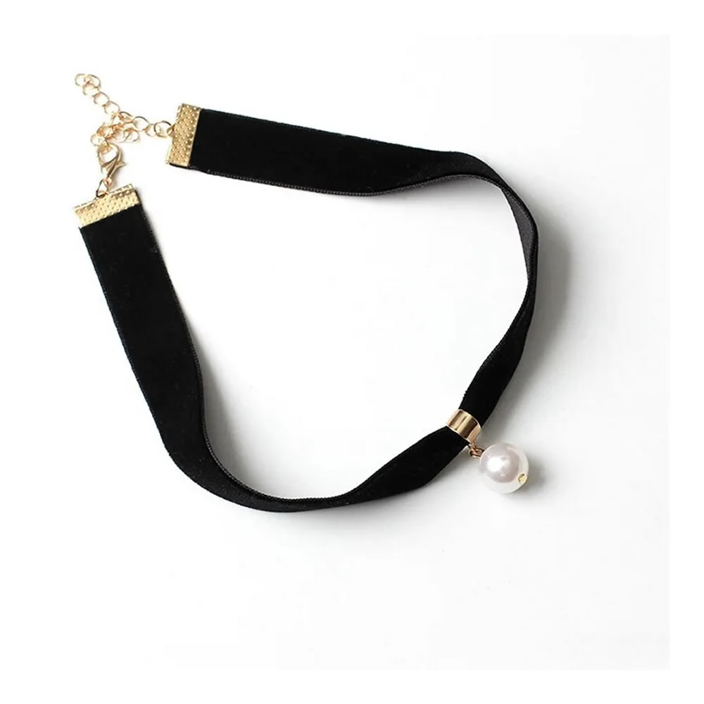 Elegantna ovratnica iz črnega žameta z belim bisernim obeskom. Ovratnica se na hrbtni strani zaključi s kovinsko verižico preko katere je možna prilagoditev dolžine. Zapenjanje je s kovinskim karabinom.
