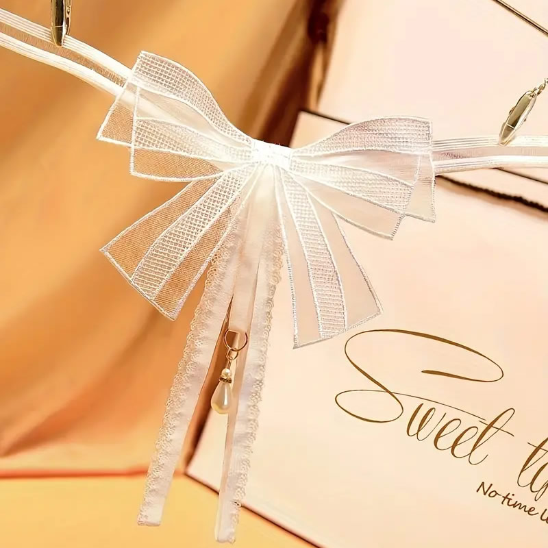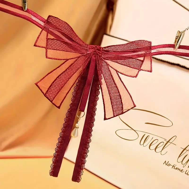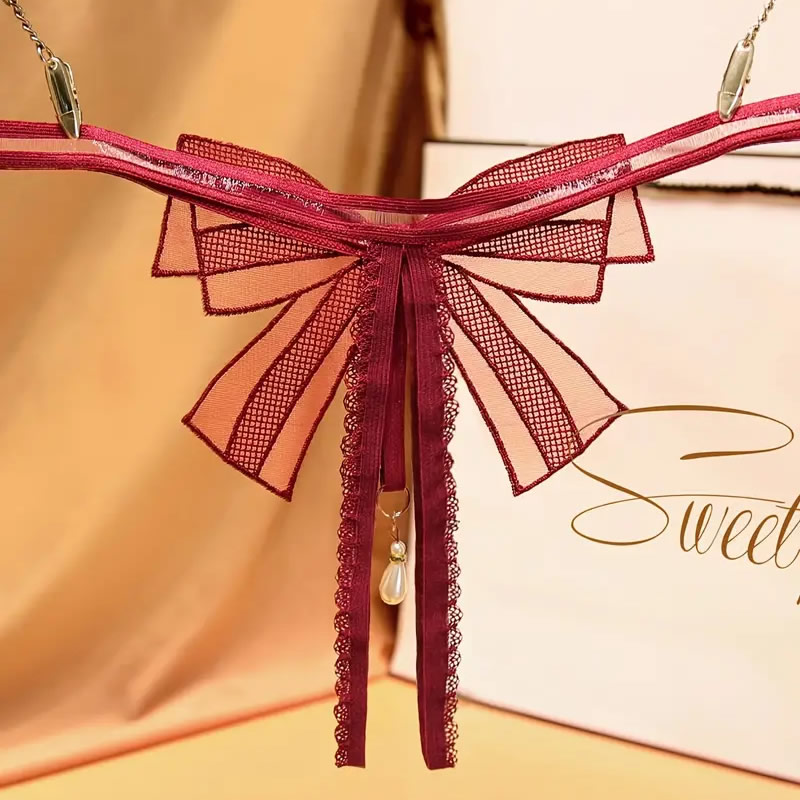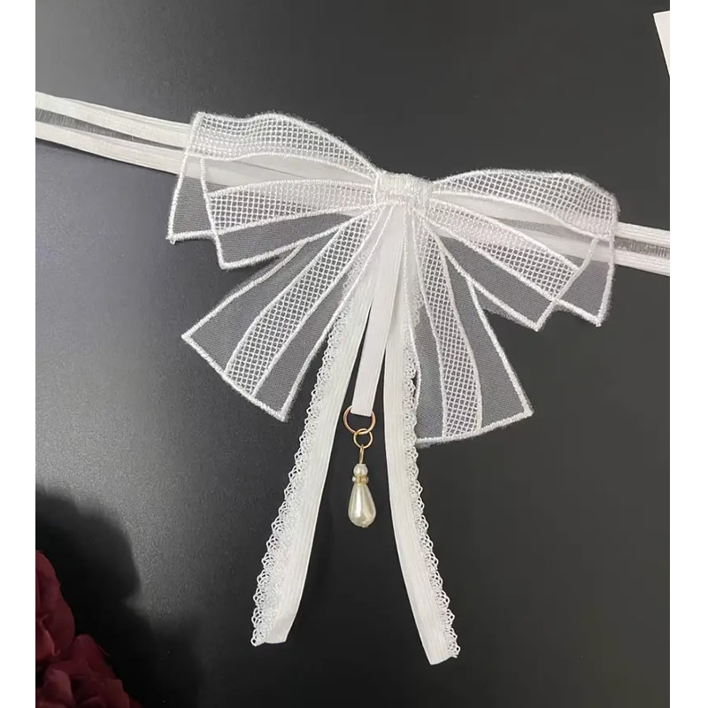 Minimalistične ženske hlačke iz elastičnih trakov! Sprednji del hlačk nad razporkom krasi elegantna pentlja v obliki metuljčka, pod njo v razporek sega obesek z luksuzno perlo. Zadnji del hlačke je minimalističen, iz dveh elastičnih trakov.