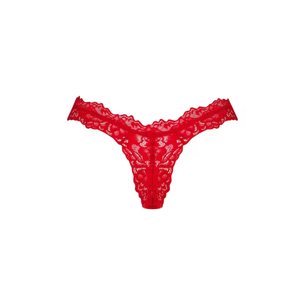 Rdeče tangice Amor Cherris by Obsessive so izdelane iz mehke, raztegljive čipke s cvetličnim vzorcem. Z majhnim dekorativnim obeskom na sprednjem delu v pasu.