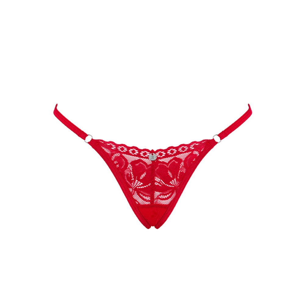 Seksi tanga hlačke v vroči rdeči barvi, izdelane iz romantične čipke in srebrnih detajlov.