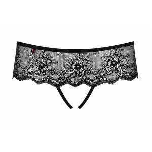 Zapeljive, vroče tanga hlačke s širokim razporkom izpostavijo povsem izpostavijo tvoje mednožje. Izdelane so iz mehke čipke v cvetličnem vzorčku . Hrbtni del krasi luksuzen detajl v lesketajoči srebrni barvi.