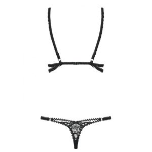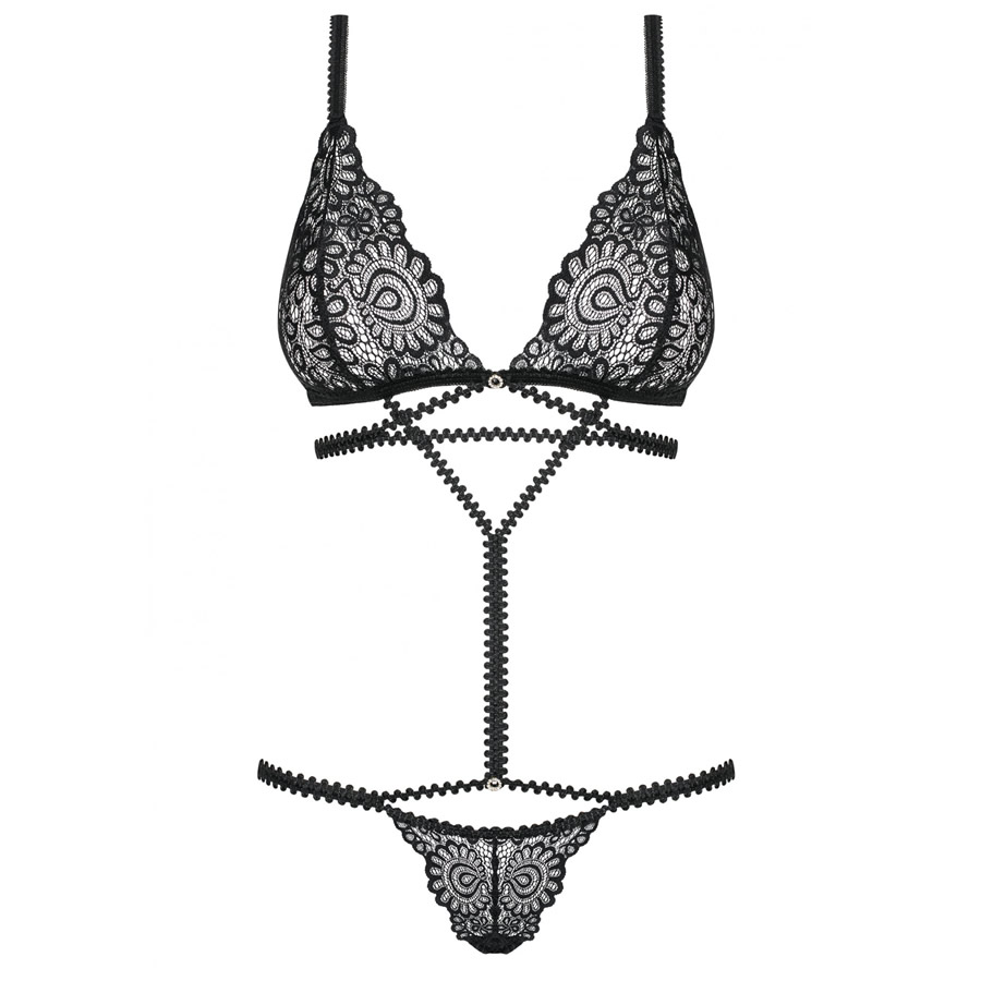 Zapeljiv ženski bodi je izdelan iz nežne čipke in elastičnih trakov. Košarici modrčka in hlačke so iz nežne čipke. Košarici sta z elastičnim trakom povezani s hlačkami, dvojni pašček, ki se ovije okrog telesa, je okrašen s svetlikajočim obročkom, enak obroček se ponovi na paščku nad hlačkami. Naramnici imata prilagodljivo dolžino.