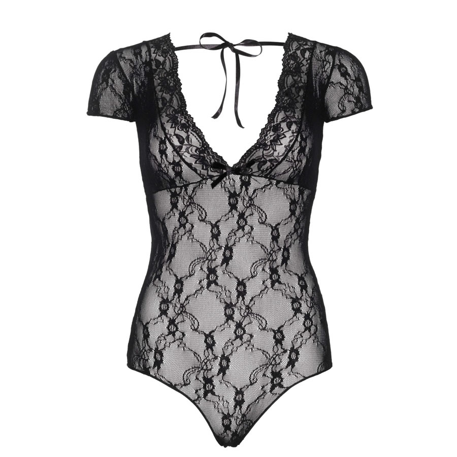 Seksi in ženstven, odličen za kombiniranje z zgornjimi oblačili. Material je elastičen, da se povsem prilega telesu. Bodi ima kratke rokave, dekolte je globok in okrašen s satenasto pentljo. Hrbet je povsem odprt, dodana ima dva traka, da bodi držita na mestu.