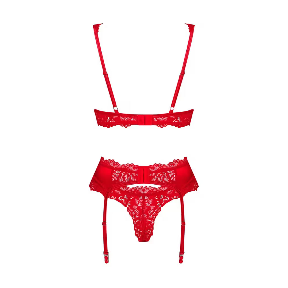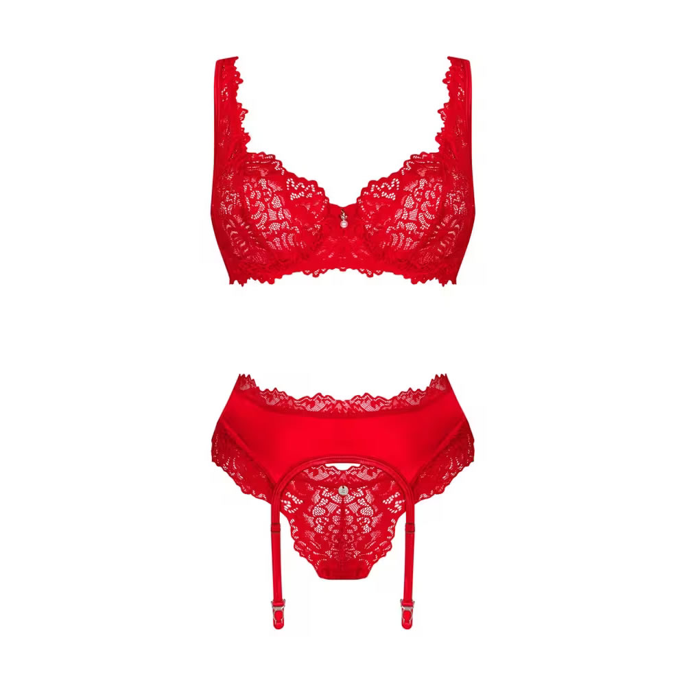 Rdeč 3-delni komplet Amor Cherris znamke Obsessive z nedrčkom, pasom za nogavice in tangicami. Vse v subtilni prozorni čipki z vstavki iz raztegljivega satena na naramnicah. Mehak in elastičen za visoko raven udobja. Nedrček z okrasnim elementom med košaricama, z žičnato oporo in nastavljivim zapenjanjem s kaveljčki na hrbtu. Naramnice in trakove za naramnice je mogoče prilagoditi.