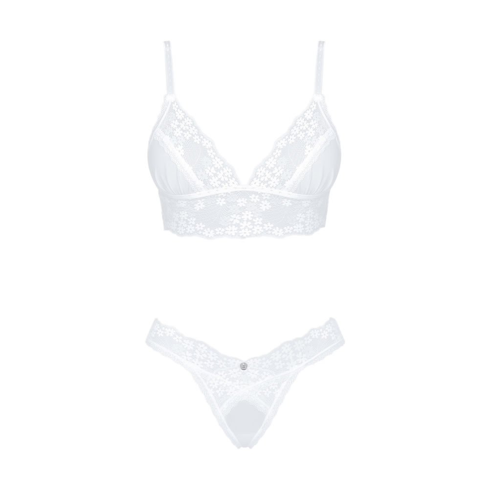 Delikatna, prosojna mrežica z vezenimi, drobcenimi rožicami ti bo ukradla srce. Komplet sestavlja top s trikotno, mehko košarico in podaljšanim delom pod prsmi in zapeljive tanga hlačke. Ne pozabi prav tako preveriti še bolj vroče, odprte verzije tega kompleta.